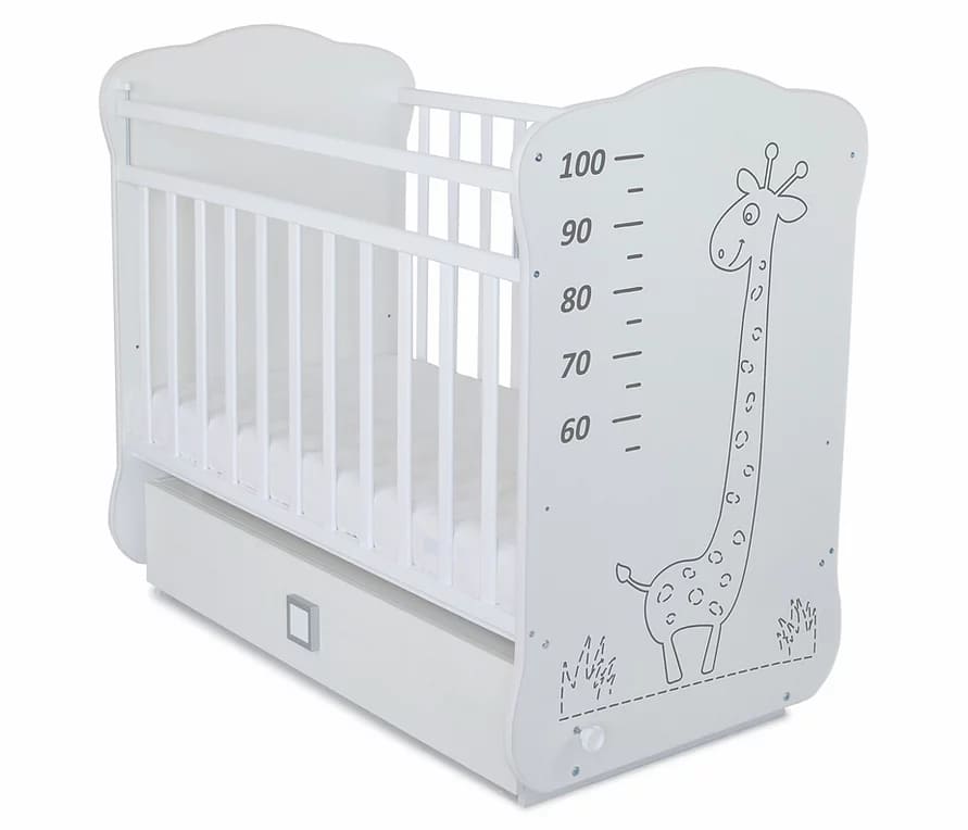 Также кровать детская СКВ-4 «Жираф» оснащена опускаемой передней стенкой и накладками из ПВХ. Под днищем расположен закрытый ящик для хранения пеленок, подгузников, постельного белья и других принадлежностей.