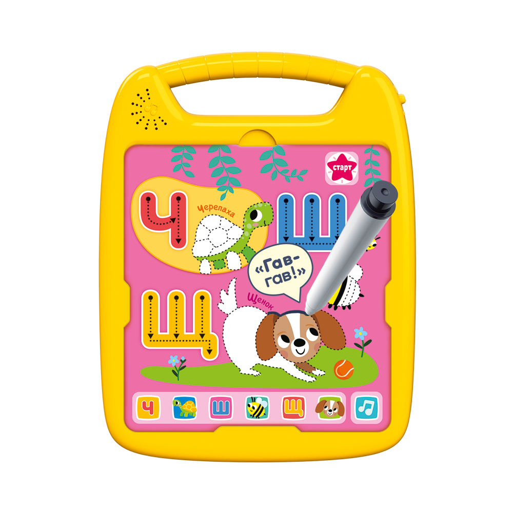 Ребёнок с удовольствием будет обводить и раскрашивать картинки с буквами, слушая при этом забавные звуки и мелодии. Их в планшетике 150!