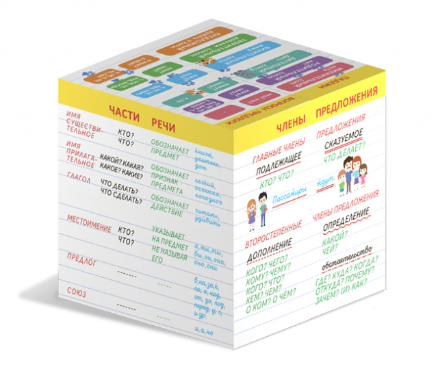 На 10-ти обучающих гранях кубика содержатся все основные правила начальной школы по русскому языку и математике: компоненты сложения, вычитания, умножения и деления, таблица умножения, площадь и периметр прямоугольника и квадрата, состав чисел, виды углов, падежи, части речи, правила переноса, части слова, члены предложения.