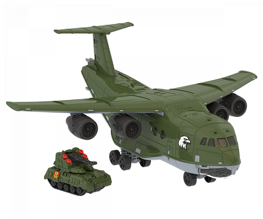 Похожа на настоящий военный самолёт. Высокая степень деталировки, прообразом игрушки послужили самолёт РА ИЛ-76.