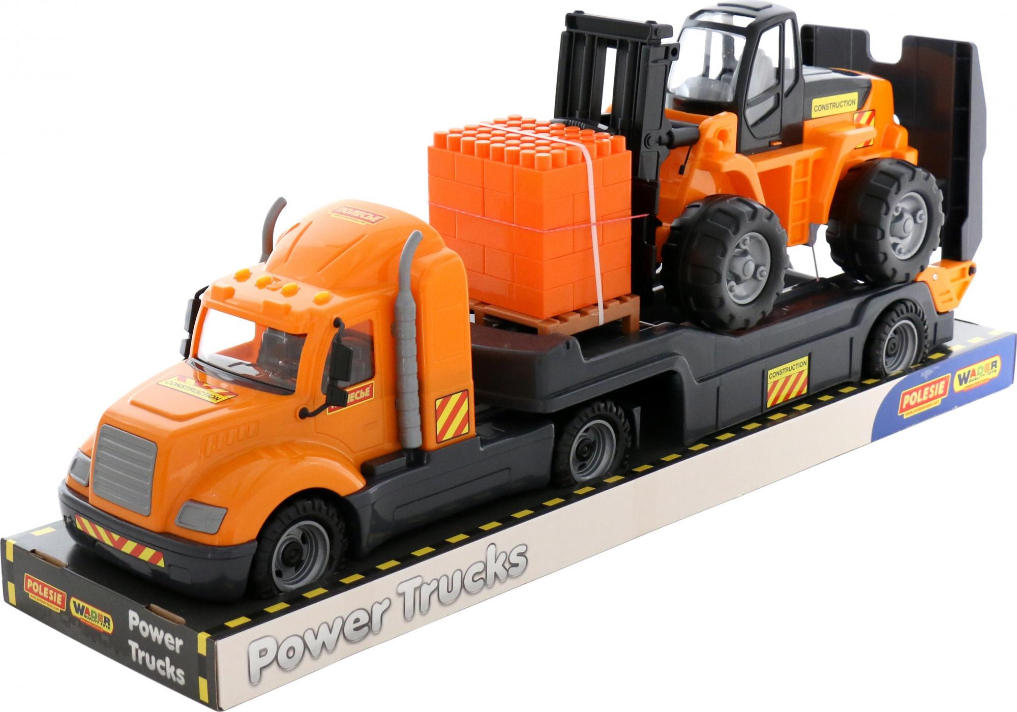 С игровым набором от Полесье и Wader вы не заскучаете! 3 игрушки в 1-й предоставляют возможность придумать множество игровых историй. Главный герой – мощный автомобиль-трейлер с вместительной грузовой платформой, в котором найдется место и автокару, и конструктору. Модели машин выполнены в едином дизайне и яркой расцветке, отлично детализированы – рельефные покрышки, «застекленная» кабина с детализацией салона. Погрузчик имеет специальные вилы для груза. Конструктор установлен на поддоне – это 30 блоков с пазовыми элементами крепления.