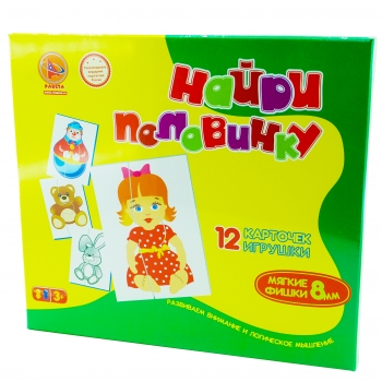 Играя, малыш научиться складывать изображения целого предмета из двух половинок. Игра представляет собой набор карточек из мягкого материала (полипропилена). на карточках находятся изображения половинок разных предметов. Яркие, красочные предметы сделают игру еще более увлекательной для ребят младшего возраста.