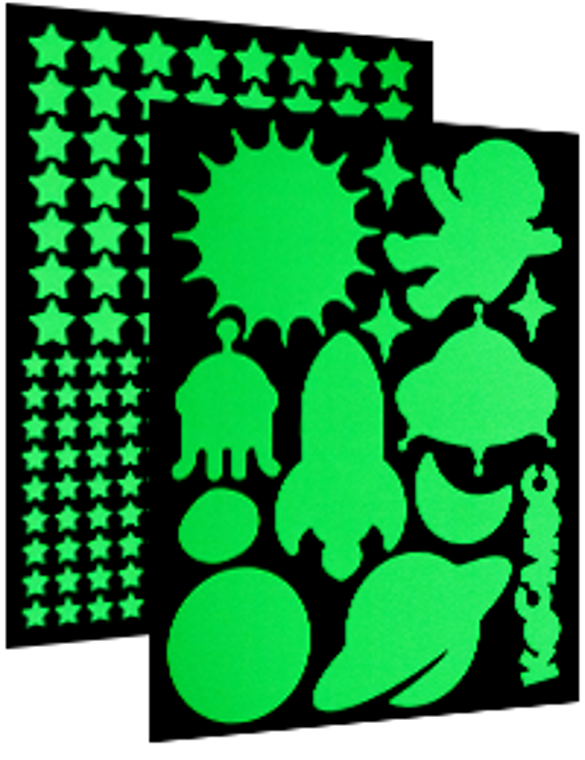 WOW! Наклейки светятся в темноте. Главное - чтобы в течение дня на них попадал свет - от окла или лампы. Яркое свечение - 30 мин., медленное затухание до 6 час. Наклейки светятся зелёным.