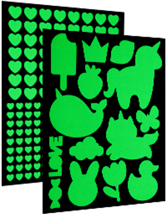 WOW! Наклейки светятся в темноте. Главное - чтобы в течение дня на них попадал свет - от окла или лампы. Яркое свечение - 30 мин., медленное затухание до 6 час. Наклейки светятся зелёным.