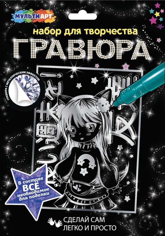 С помощью данного набора юный художник сможет создать эффектную серебристую картину на чёрном фоне. Контур рисунка уже нанесён на основу, остаётся только процарапать изображение специальным штихелем. Готовую поделку можно подарить близким или использовать для украшения интерьера.