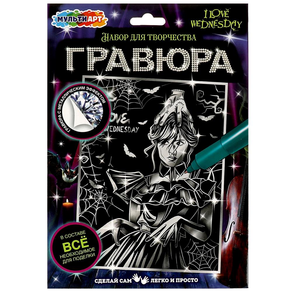 С помощью данного набора юный художник сможет создать эффектную серебристую картину на чёрном фоне. Контур рисунка уже нанесён на основу, остаётся только процарапать изображение специальным штихелем. Готовую поделку можно подарить близким или использовать для украшения интерьера.