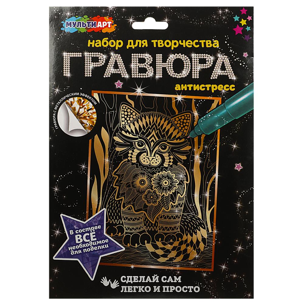 С помощью данного набора юный художник сможет создать эффектную золотистую картину на чёрном фоне. Контур рисунка уже нанесён на основу, остаётся только процарапать изображение специальным штихелем. Можно не повторять каждую черточку, главное - соблюдать направление штриха! Готовая поделка станет отличным вариантом для подарка близким или для украшения интерьера комнаты.