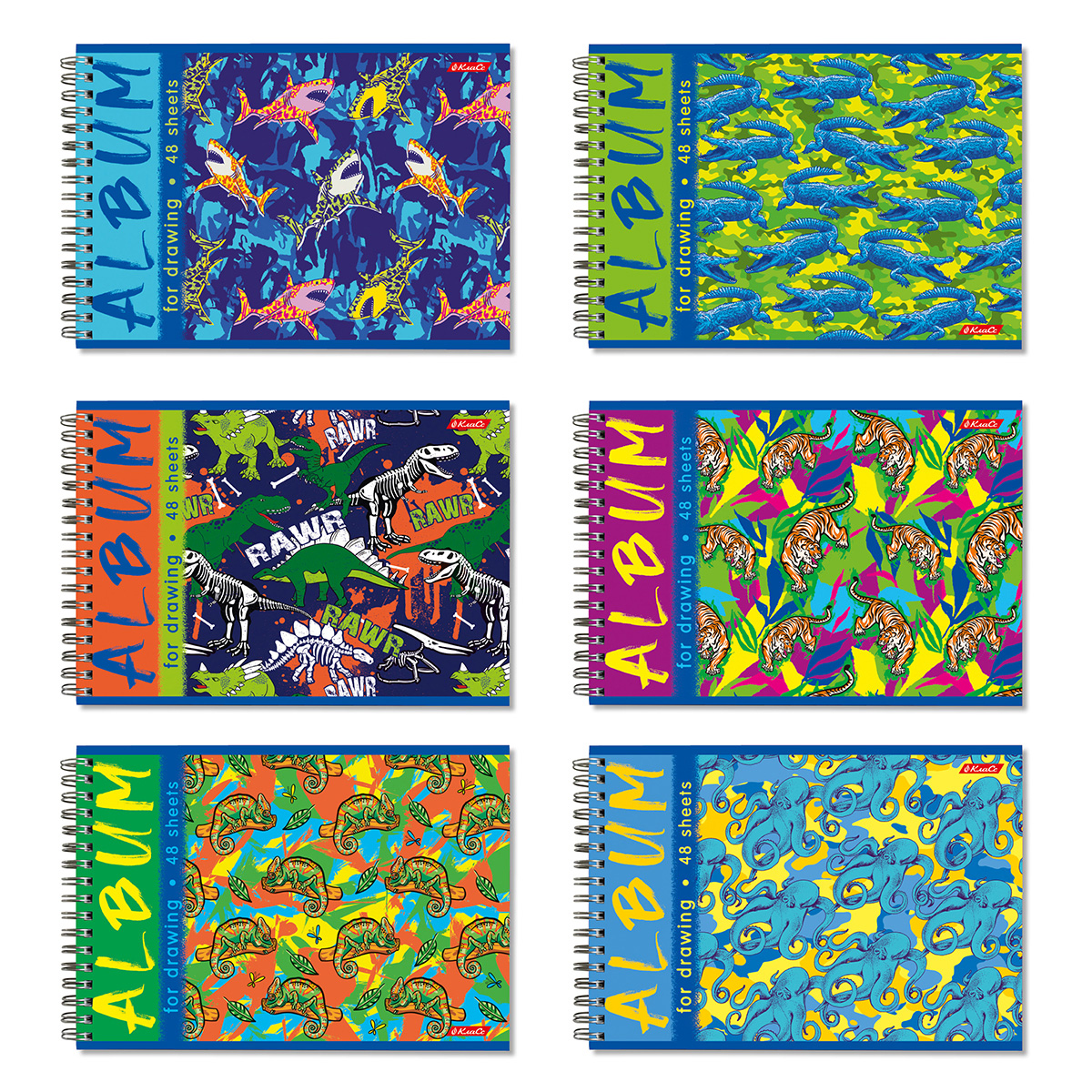 Формат А4 . Вид скрепления - гребень. Обложка из мелованного картона плотностью 190 г/кв. м. Альбомы упакованы в термоусадочную пленку по 6 штук - 1 альбом каждого дизайна.