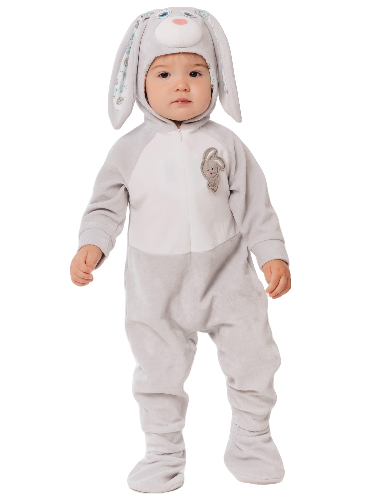 Карнавальный костюм Зайчик из серии "Ладушки-игрушки" для малышей до 1 года. Очаровательный костюм подойдет как мальчику, так и девочке. Серый комбинезон на молнии с капюшоном и закрытыми носочками. Материал изделия - натуральный хлопок.