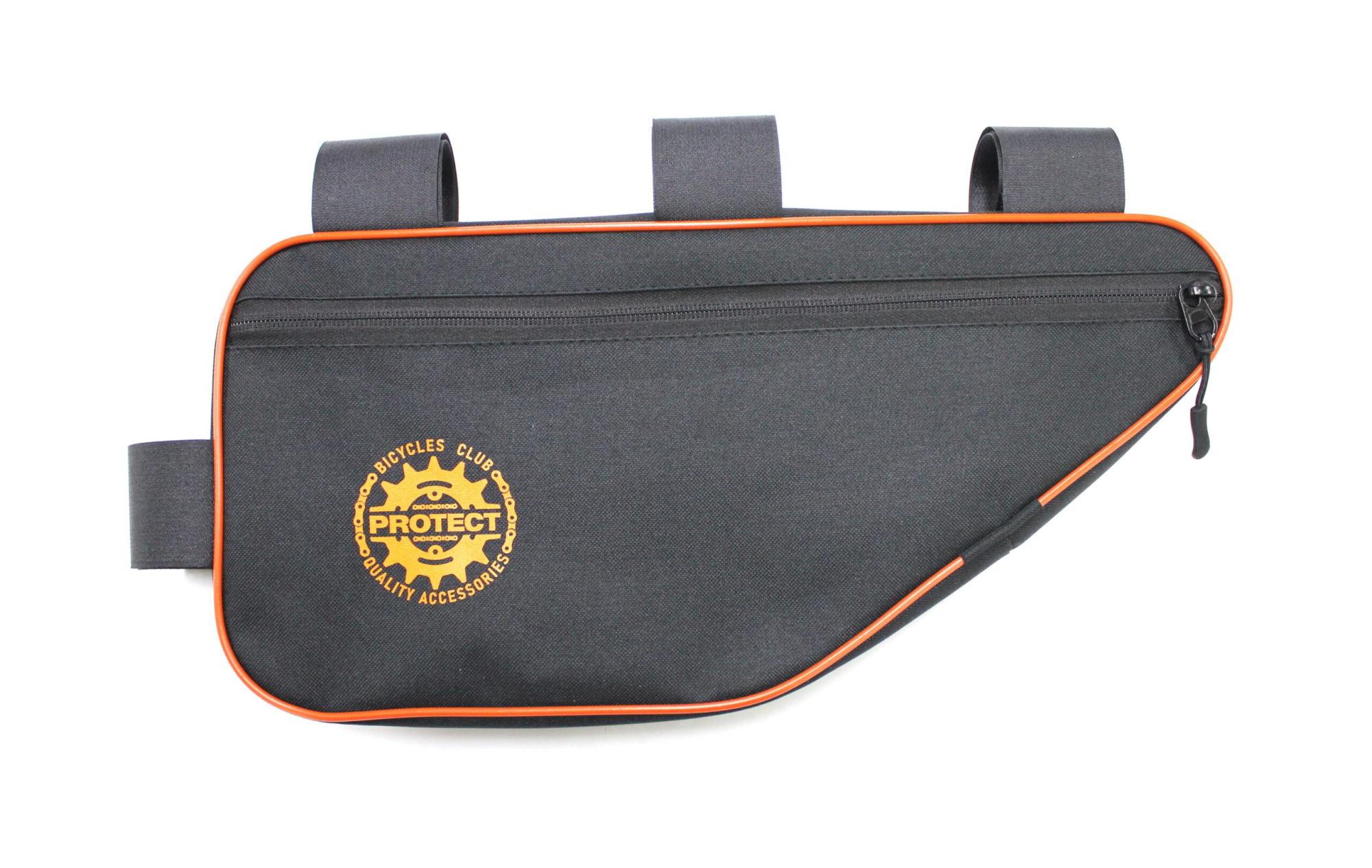 Треугольник сшит из ткани с водоотталкивающим покрытием, усиленный кант держит форму сумки, а красивый логотип гармонирует с цветом канта. Сумка фиксируется на раме велосипеда при помощи контактной ленты.